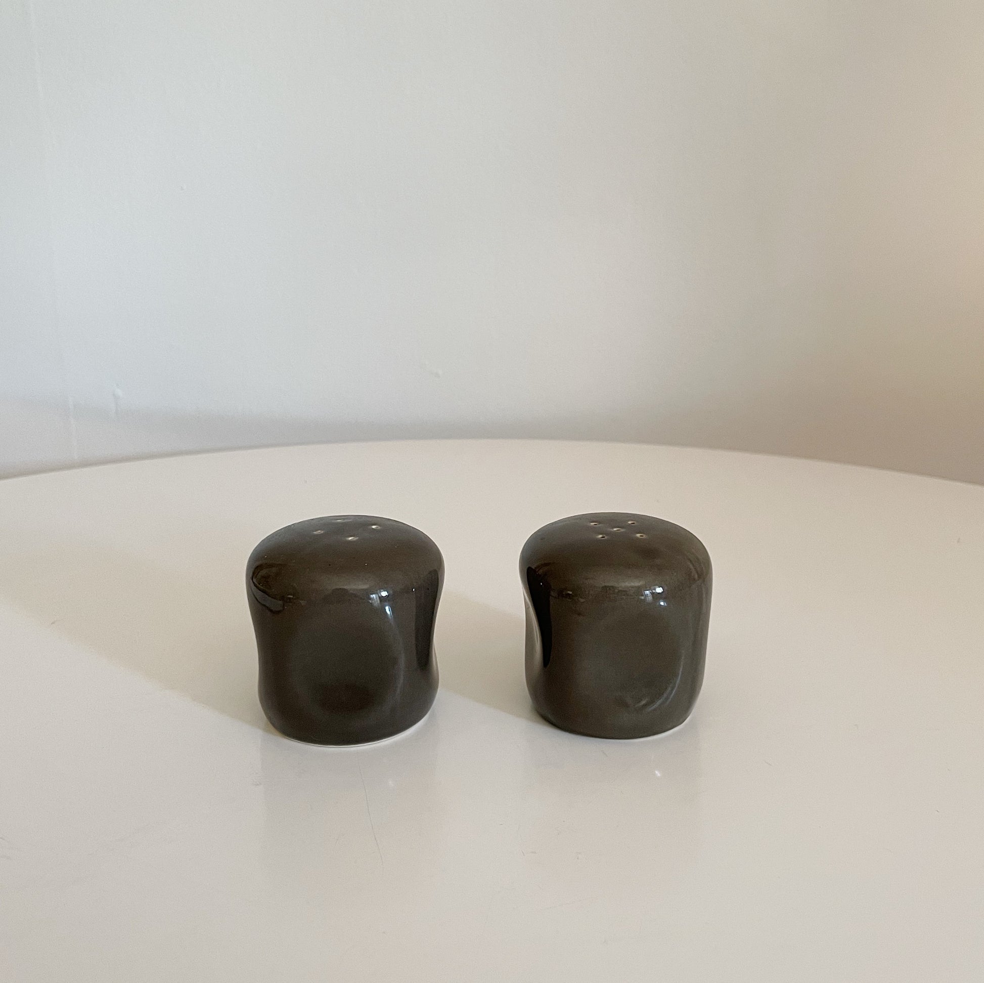 Set of brown ceramic salt and pepper shakers, featuring a curvy silhouette and rounded corners making them not only aesthetically pleasing but easy to use