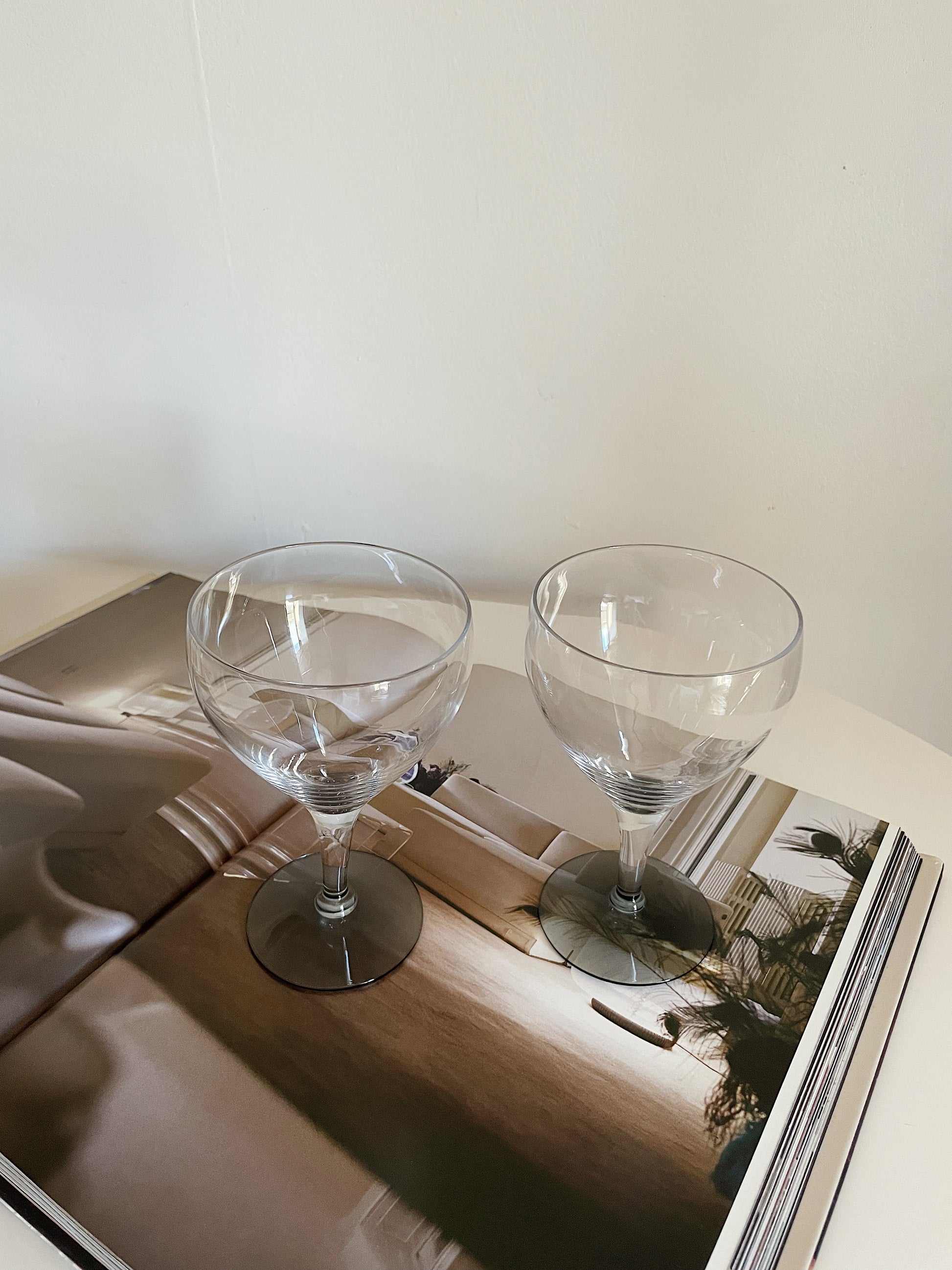 A set of two glasses with a wide cup and a lovely base in a subtle grey hue, perfect for your next happy hour at home