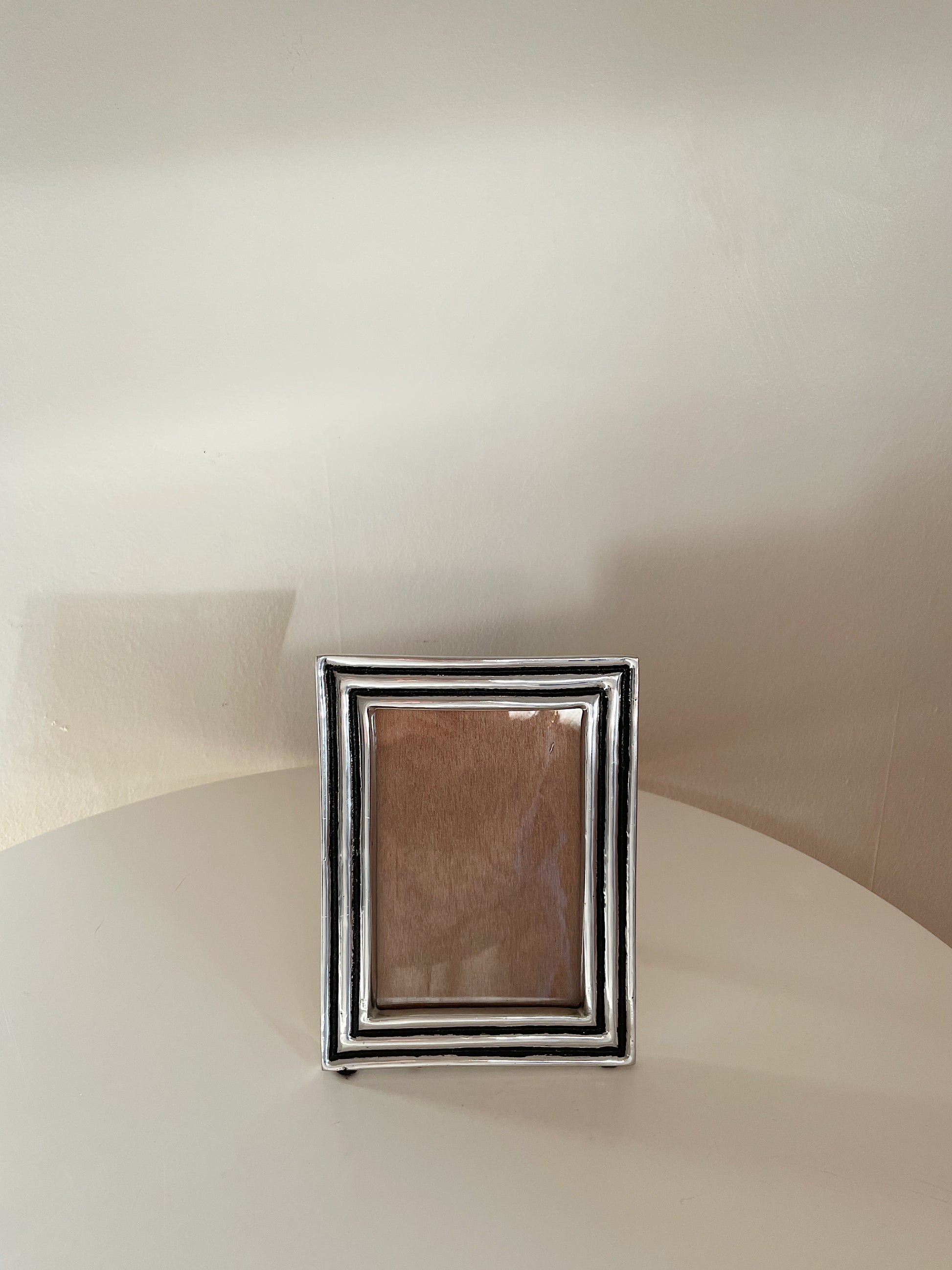 Pewter picture frame featuring a multi-layered, ornate border design, holds a 4" x 6" photo