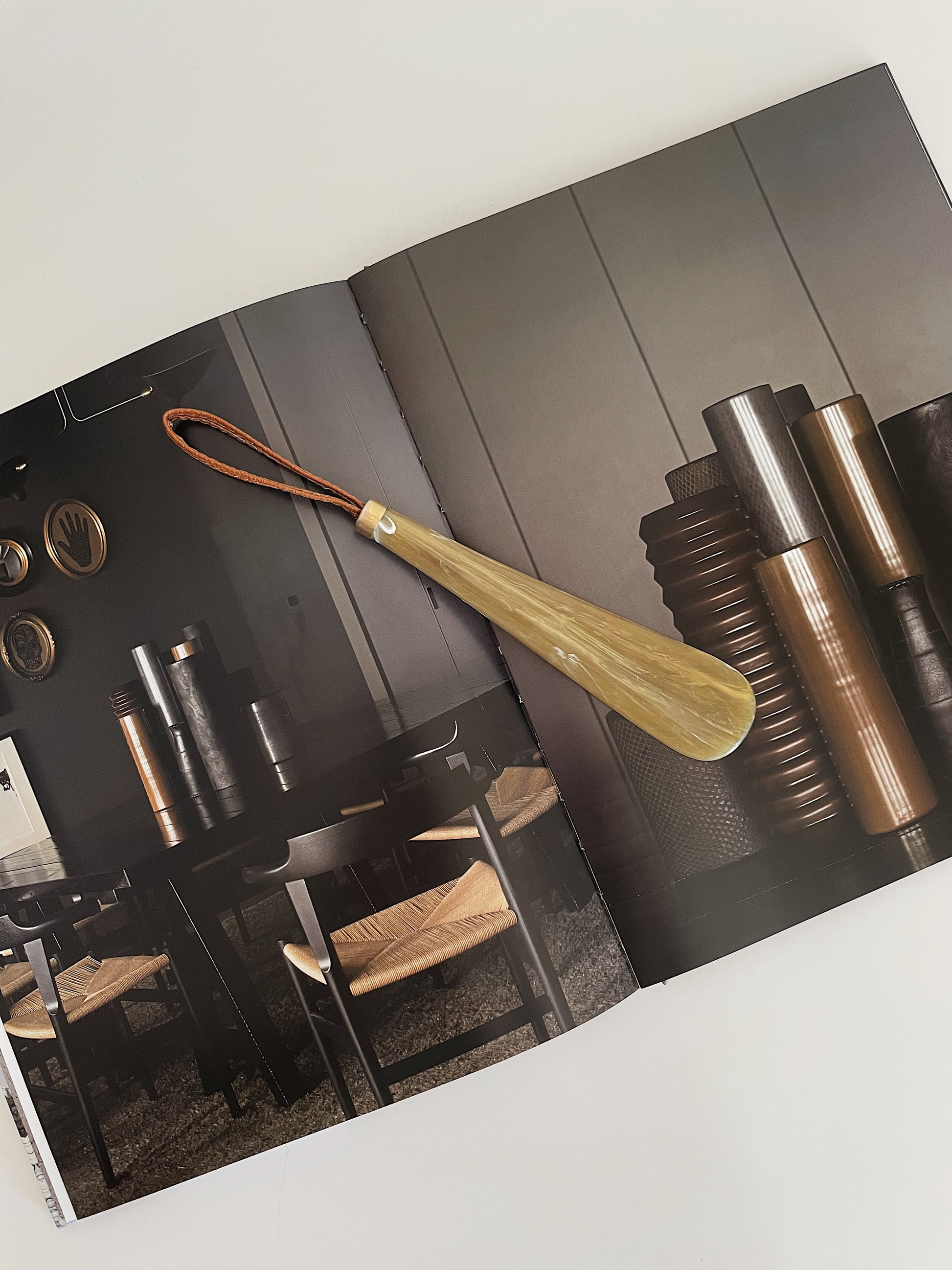 Shoe horn made of horn and features a leather strap